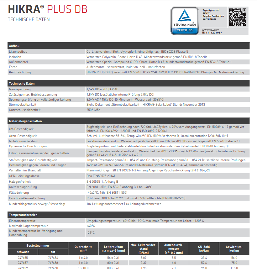 - Nennspannung (Uo/U): AC 0,6/1,0kv / DC 0,9/1,5kv