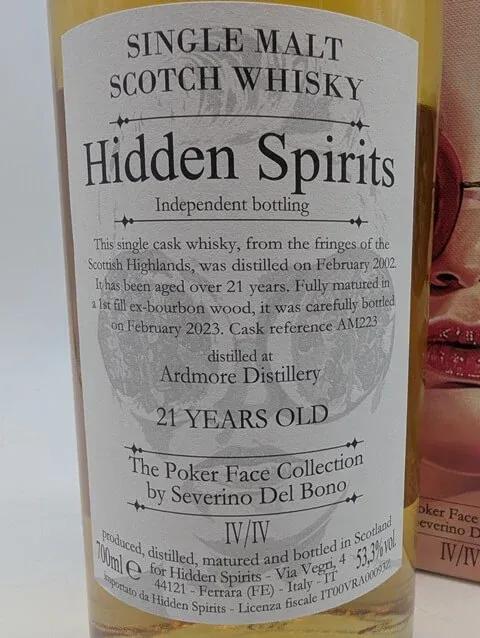 Dieser 21 Jahre alte Ardmore wurde für die Poker Face Collection von Hidden Spirits abgefüllt. Der Wehisky wurde 2002 destilliert und im Februar 2023 mit 53,3% abgefüllt.