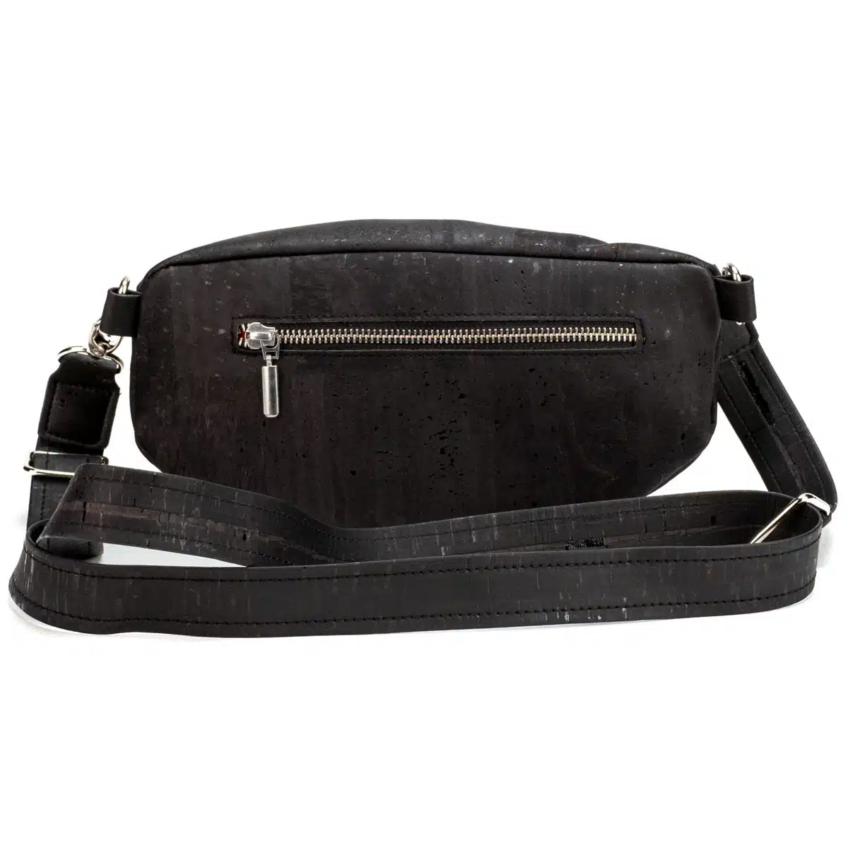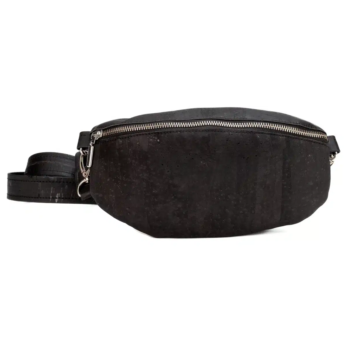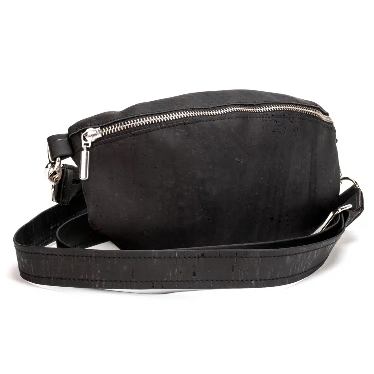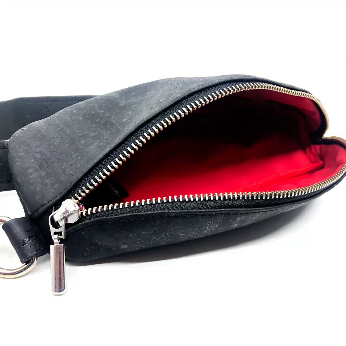 Brusttasche aus Kork «Black» von Artelusa mit Reissverschluss sowie rotem Innenleben.