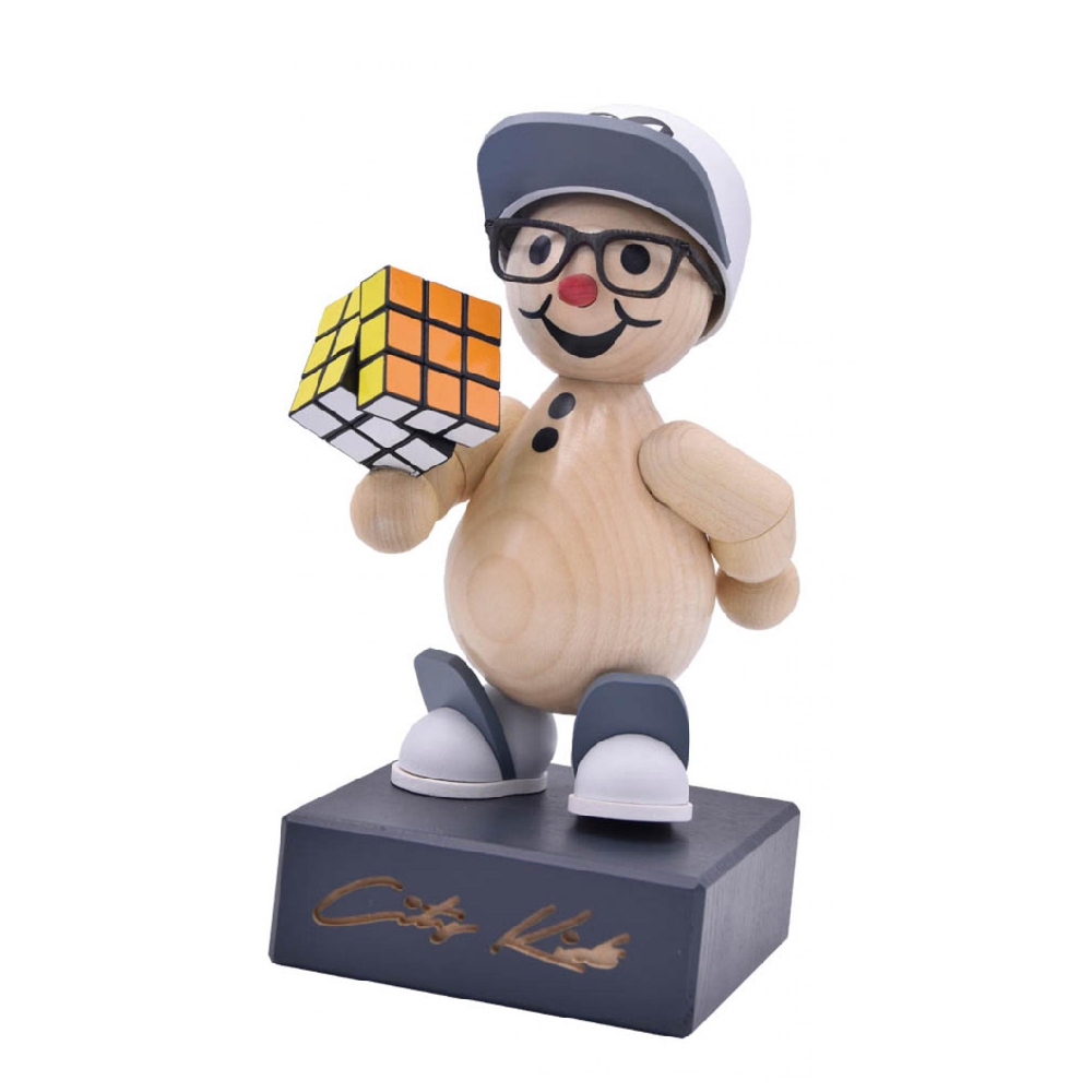 Dieses City Kid Lennart ist der Schaue der Clique, man sieht ihn nie ohne Brille und Zauberwürfel, welchen er in Rekordzeit löst. Selbstverständlich ist auch Lennart Hipp und Cool gestylt, die graue Cap passt perfekt zu seinen Sneaker. Die City Kids tun all die coolen Dinge die Kinder aus der Stadt so machen, shoppen gehen, skaten oder chillen. Der Schriftzug City Kid ziert in Graffiti Optik den Sockel der kleinen – großen Figuren.