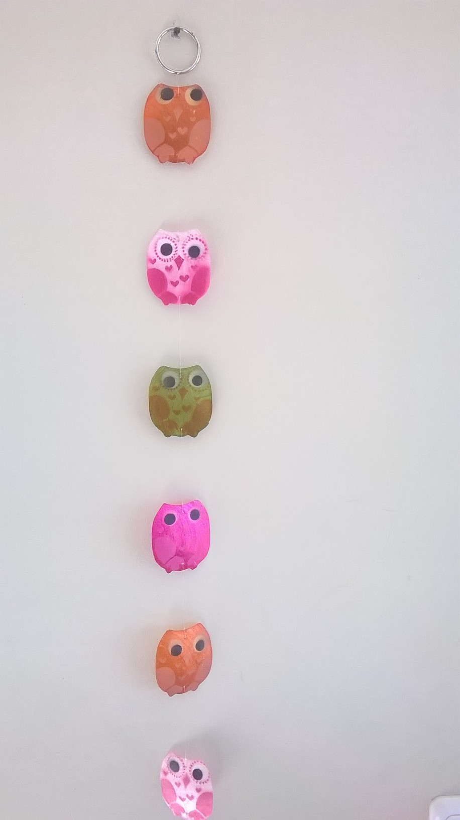 Die Eulen Fenstergirlande besteht aus 14 Capiz-Muschel Hängern im Eulen Design in 5 verschiedene Farben, die mit einem Nylon Faden verbunden sind. Die Deko Eulen Girlande hat oben einen Metallring zur Aufhängung. Mann kann die Dekorationskette auch problemlos teilen oder kürzen. So kann man ganz einfach eine tolle Deko zaubern z.B. als Hängeverziehrung an einem Lampenschirm, Kinderzimmerdeko, Fensterschmuck, Fensterdekoration, Raumschmuck, Wandschmuck, zum aufpeppen von Ästen (ob im Garten am Strauch oder in der Vase).