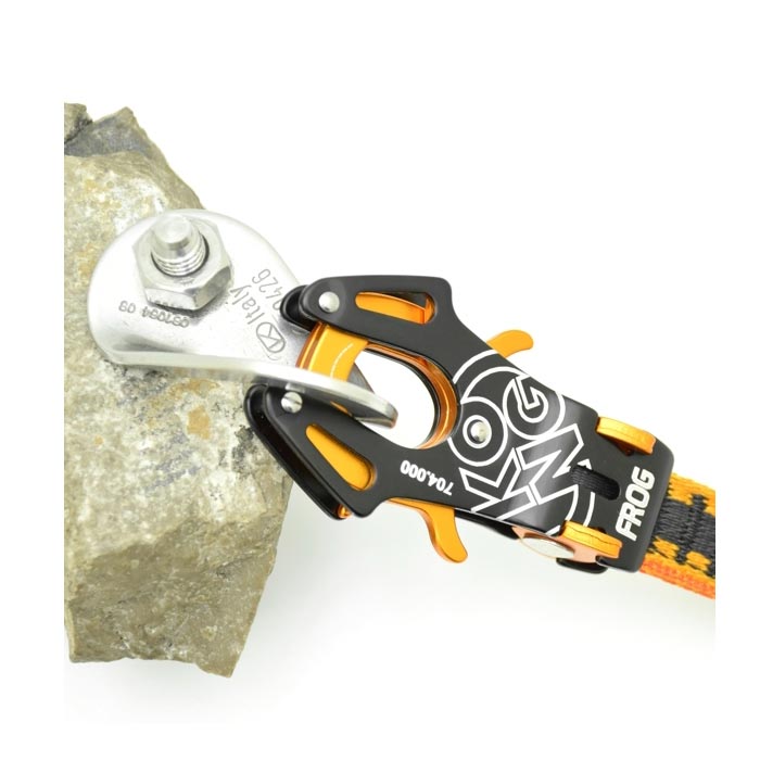 - fixer „Frog“ Karabiner mit smarten Mechanismus der ihn zuerst offen hält