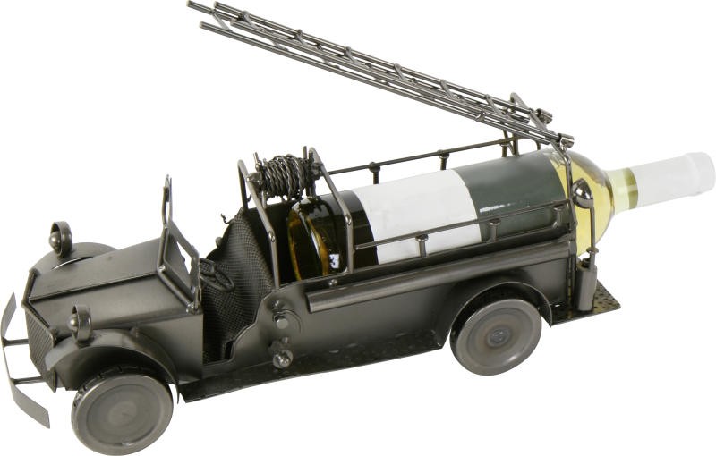 Detailreich und komplett aus Metall gefertigt beschützt der Flaschenhalter Feuerwehrauto Skulptur das ihm anvertraute Getränk und sorgt für guten und sicheren Stand.