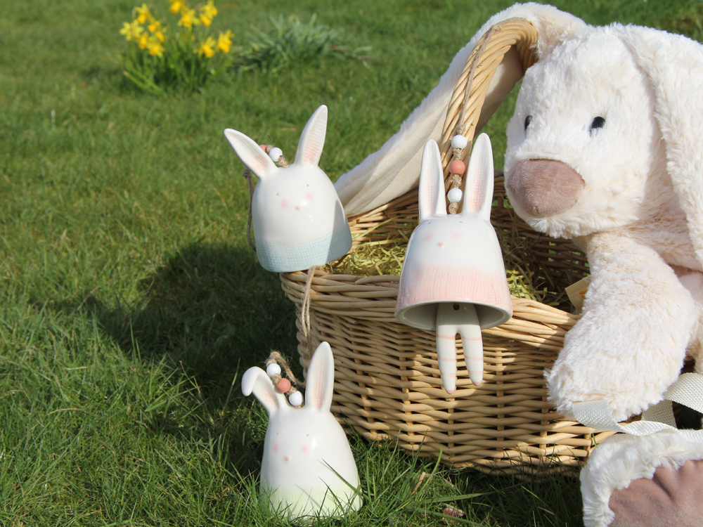 Ein Keramik Hase zum Hängen ist eine etwas andere Frühjahrs / Osterdeko. Bei leichtem Wind, oder wenn die Kinder die Glocke anstupsen, erklingt der Keramikklang und läutet den Frühling ein.