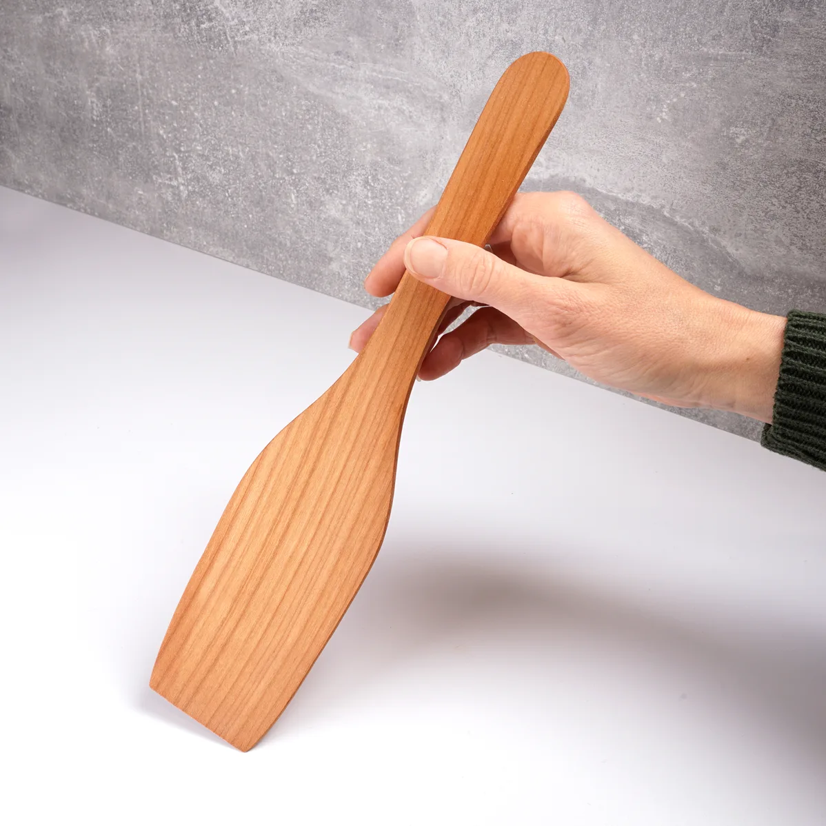 Die Kelle dieses Pfannenwenders ist geschweift bzw. noch oben gebogen, was die Handhabung in Pfannen und Kochgeschirr mit hohen steilen Rändern vereinfacht. Zudem ist sie, wie auch unsere weiteren Pfannenwender von unten angeschliffen, so dass man vorne eine zulaufende Spitze hat, mit der man unter das Gargut greifen kann und den Pfannenwender auch zum Servieren verwenden kann. Dieser Küchenhelfer aus Kirschbaumholz wurde in handwerklicher Perfektion hergestellt und anschließend geölt. Er liegt ideal in Deiner Hand. Das hitzebeständige Holz schont Dein empfindliches Kochgeschirr und bleibt auch bei hohen Temperaturen stabil, ohne sich aufzulösen. Auch als natürliches Haushaltsgeschenk kommt er bei Familie und Freunden hervorragend an! Du kannst den Wender ganz einfach so verwenden, wie er ist, oder individuell mit Brandmalerei, Lasergravur oder Laubsägemotiven gestalten.