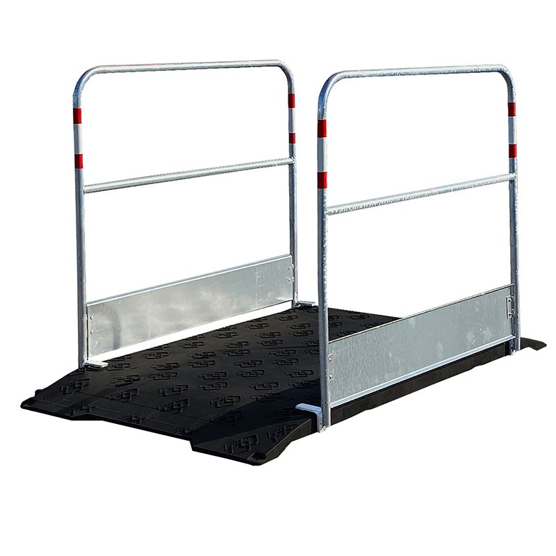 Im Lieferumfang enthalten sind außerdem 2 Geländer zur seitlichen Absicherung. An den Geländern sind jeweils zwei rot/weiß reflektierende Folien angebracht.