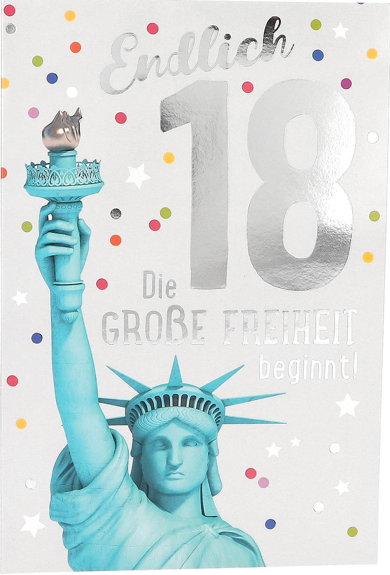 Die Vorderseite der Karte ist ein lebendiges Farbenspiel aus fröhlichen Punkten, die die Aufmerksamkeit auf sich ziehen. Im Mittelpunkt thront die majestätische Freiheitsstatue, flankiert von einer glänzenden silbernen 18. Schon beim ersten Blick verspricht die Karte eine einzigartige Überraschung.