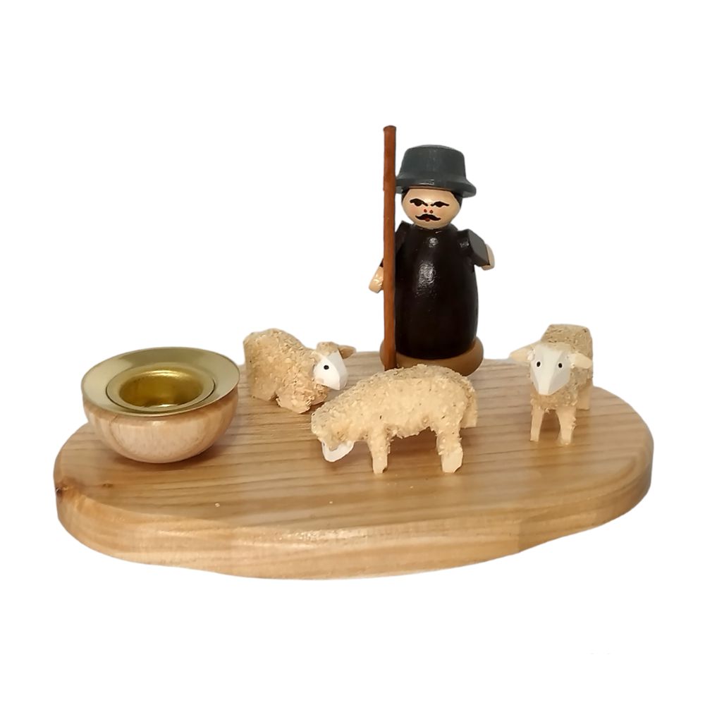 Auf dem runden, natur-farbenen Podest hat sich ein Schäfer samt Herde niedergelassen. Der Schäfer in schwarzem Mantel sowie schwarzem Hut hält einen Schäferstab in der Hand während eins seiner Schafe vor ihm gemütlich auf dem Boden liegt, Zwei weitere Schafe stehend fressend neben dran.