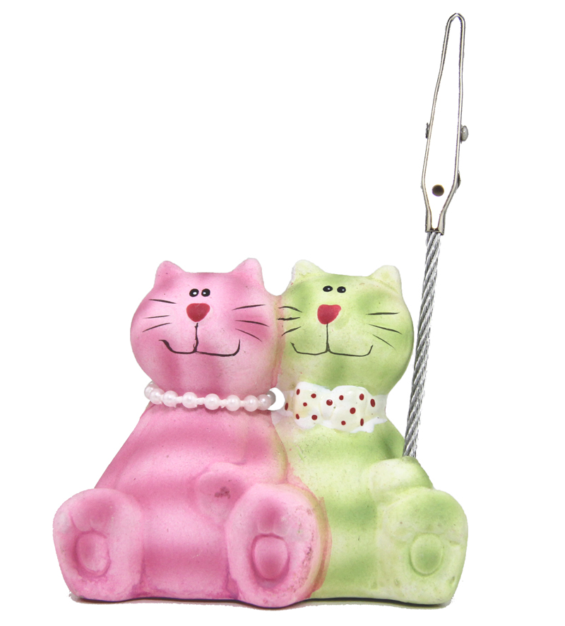 Dieser kitschige Katzen Kartenhalter hält Postkarten und Fotos fest.