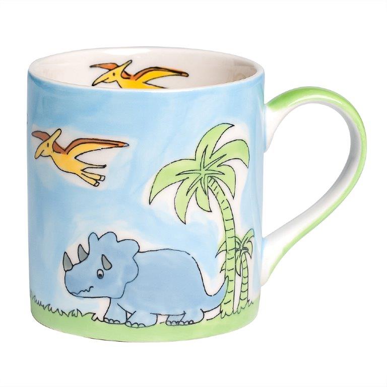 Motiv: hellblauer Kinderbecher mit grünem Henkel, Pflanzen und Wiese. In der Luft fliegt ein gelber Pteranodon und auf der Wiese steht ein blauer Triceratops