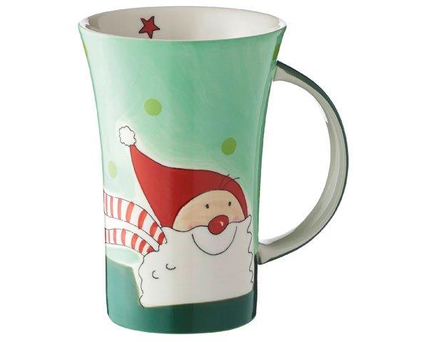 Motiv: hellgrüner Becher mit dunkelgrünem Henkel und Leiste und blassen, grünen Punkten. In der Mitte befindet sich ein lustiger Weihnachtsmann Oberkörper, der freundlich lächelt durch seinen weißen Bart, eine rote Mütze und einen rot, weiß gestreiften Schal trägt.