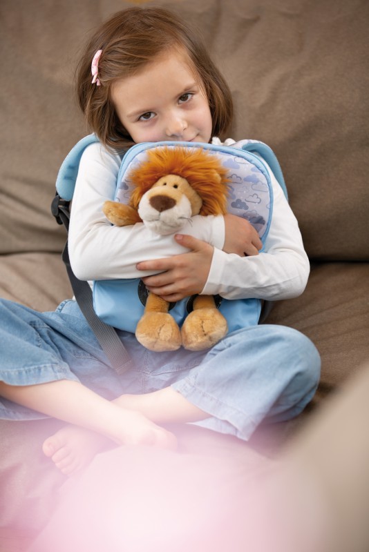 Das Highlight des Rucksacks ist der süße Löwe aus flauschig weichem NICI-Plüsch, der in einer separat befestigten Sitztasche mit Gummizug fixiert ist. Der 25 cm große Löwe schaut sich die Welt vom Rücken des Kindes aus an und kann kinderleicht herausgenommen werden, um zum Schmusen, Spielen und Liebhaben bereit zu stehen. So haben Kinder ihren besten Freund immer dabei, egal wohin es geht.