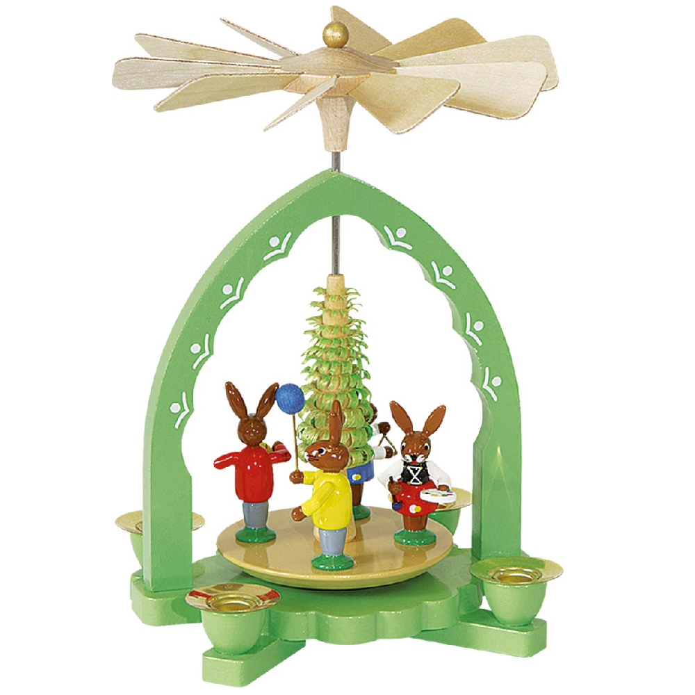 Im frühlingshaften Grün präsentiert sich diese Osterpyramide Hasenkinder in deren Mittelpunkt Vier kleine, farbige Hasenkinder stehen, fröhlich feiern die schokobraune Hasen den Frühling, sie musizieren, bemalen Ostereier und erfreuen sich der warmen Sonnenstrahlen.