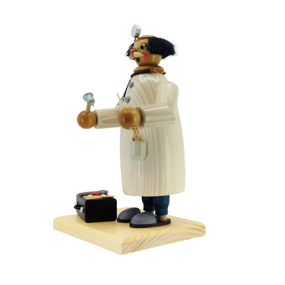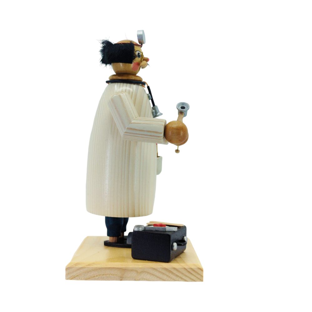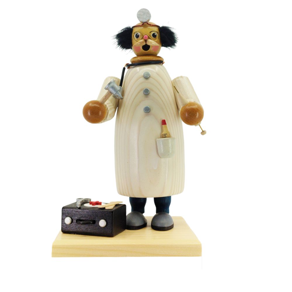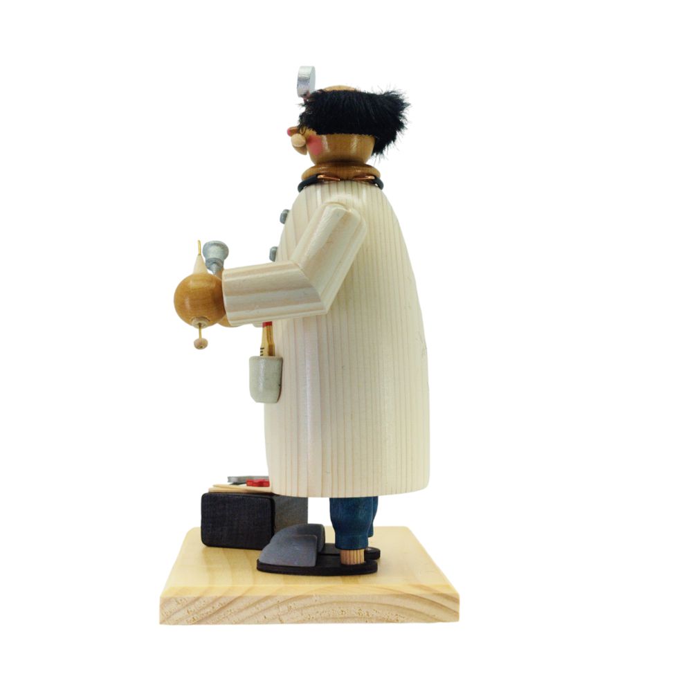 Der Räuchermann ist in einen weißen Kittel mit silbernen Knöpfen gekleidet, was seine medizinische Autorität betont. In seiner Tasche steckt ein Fieberthermometer, stets bereit für die Diagnose. In der Hand hält er eine Spritze sowie ein Otoskop, Instrumente seines Handwerks, die er geschickt einsetzt.