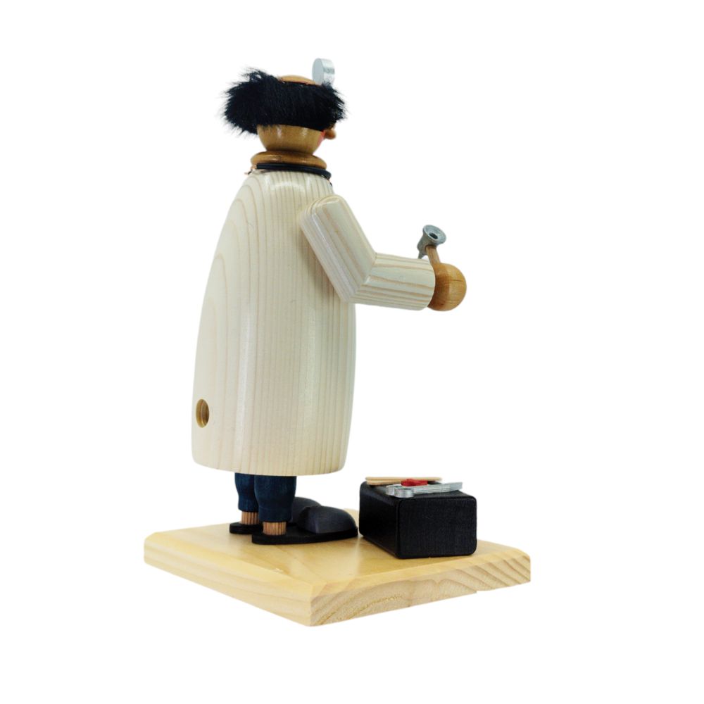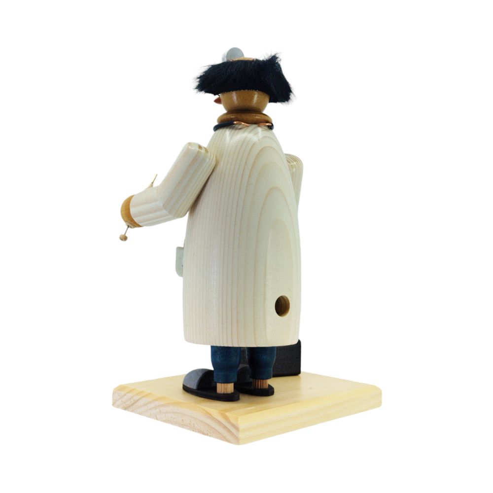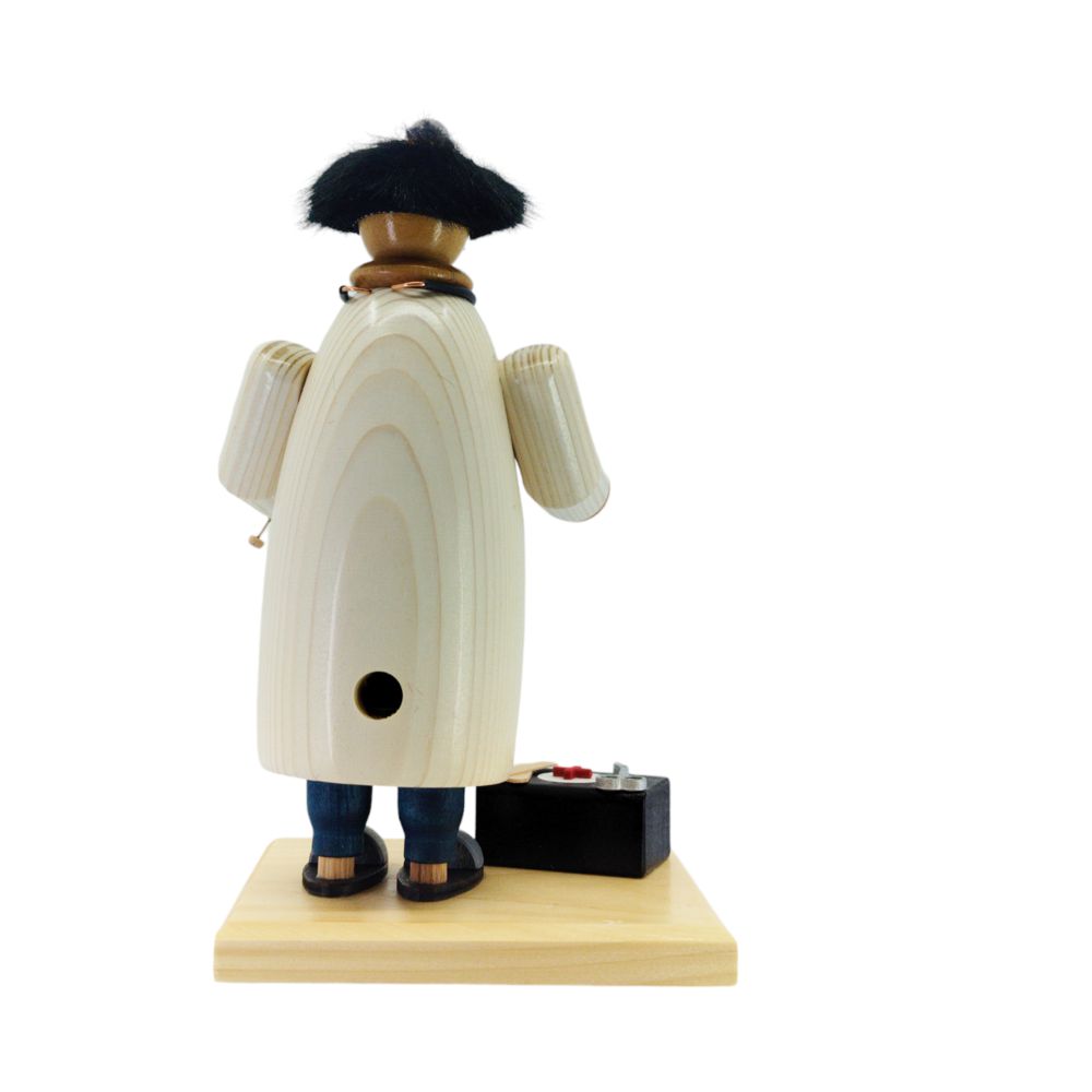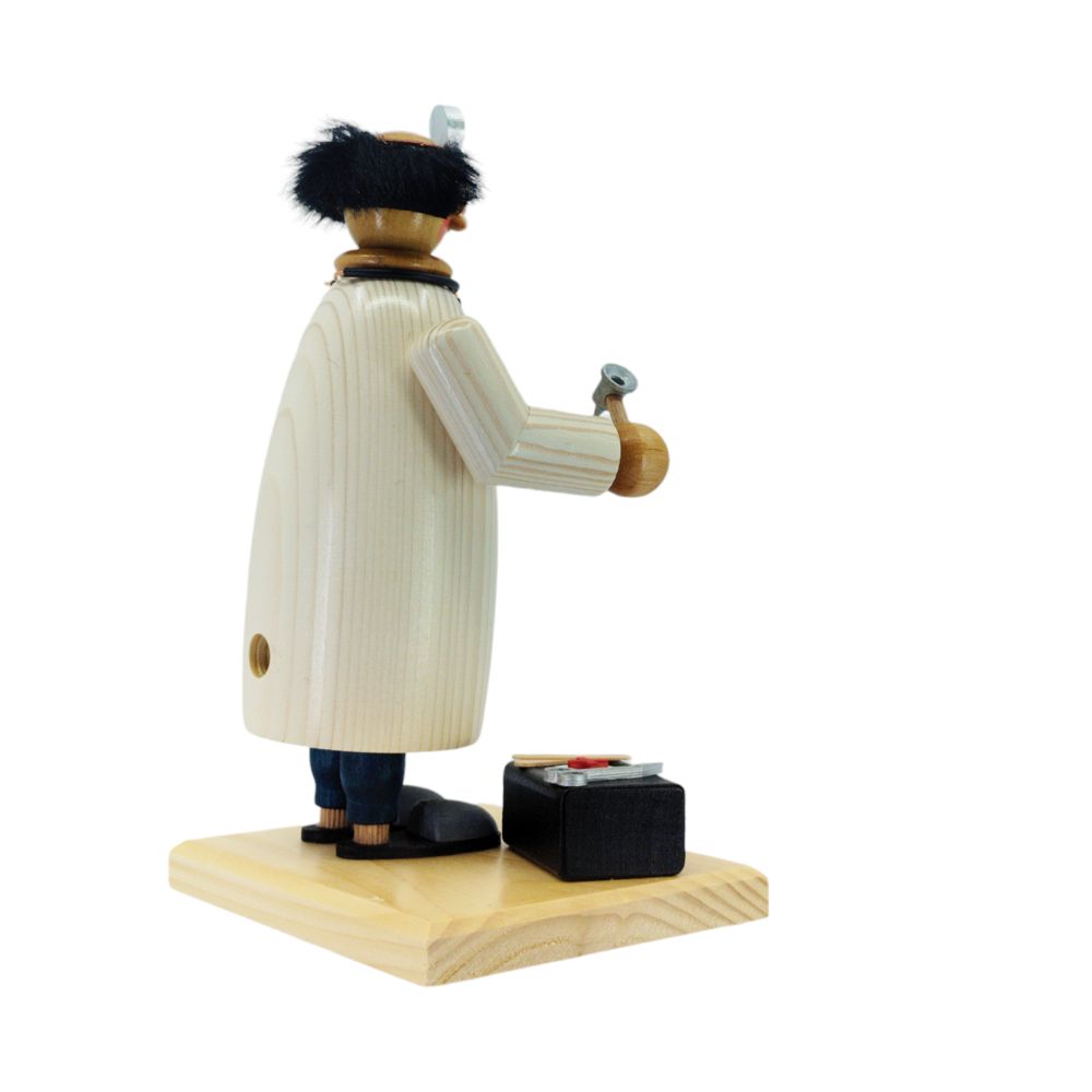 Der Räuchermann ist in einen weißen Kittel mit silbernen Knöpfen gekleidet, was seine medizinische Autorität betont. In seiner Tasche steckt ein Fieberthermometer, stets bereit für die Diagnose. In der Hand hält er eine Spritze sowie ein Otoskop, Instrumente seines Handwerks, die er geschickt einsetzt.