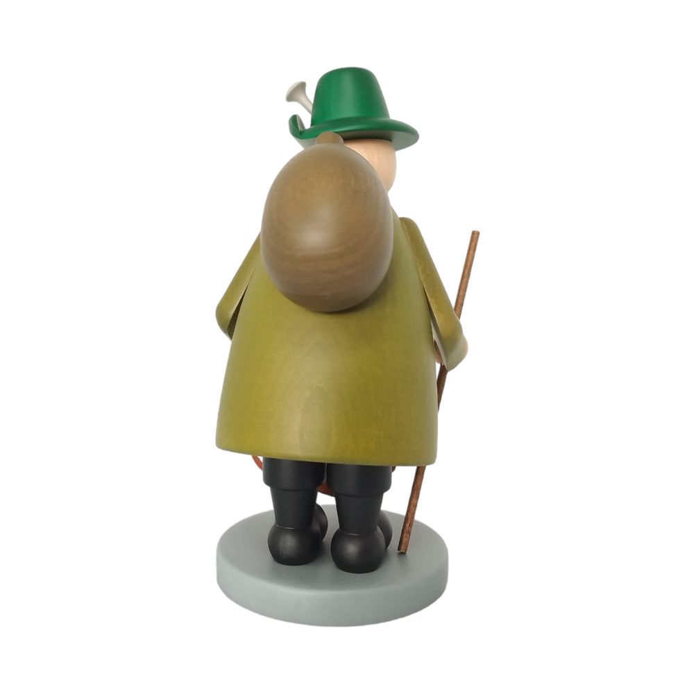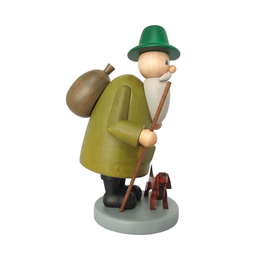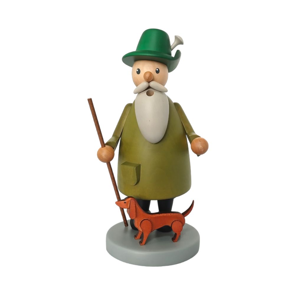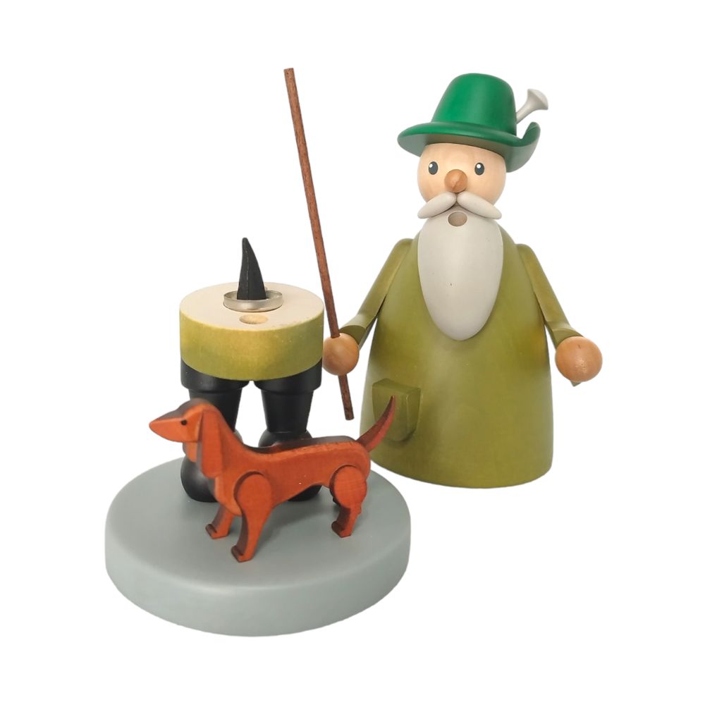 In grünem Gewand gekleidet steht der Räuchermann Förster mit Dackel, in seinen schwarzen Stiefeln, fest auf einem kleinen Podest, um den Hals baumelt ein Fernglas während er sein Gewähr über der Schulter hängen hat, in der Hand hält er einen Wanderstock und natürlich ist sein treuer Begleiter, ein kleiner, brauner Dackel mit dabei. Das freundliche Gesicht mit den großen Augen, der runden Knollennase sowie dem weißen Vollbart wird am Kopf von einem grünen Jägershut geschmückt.
