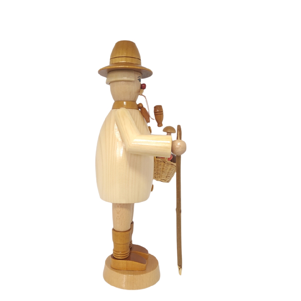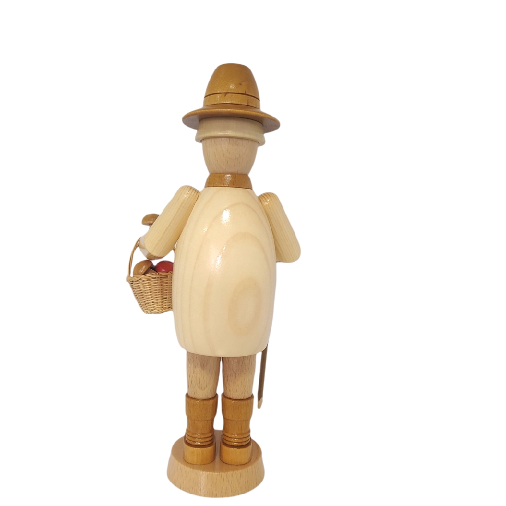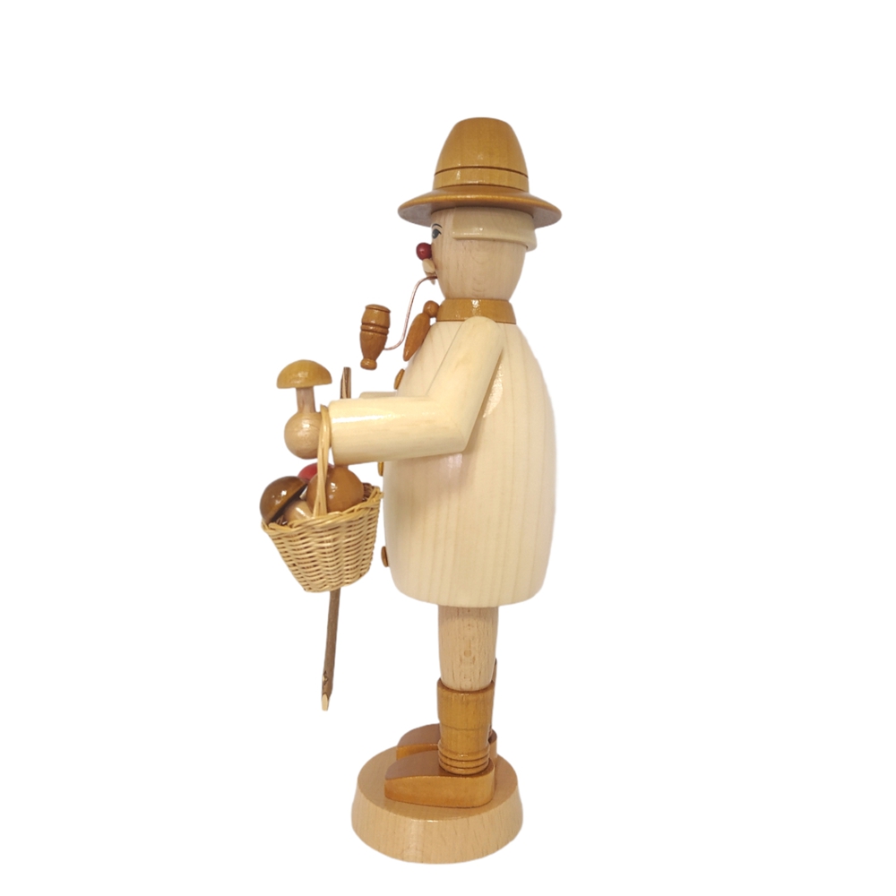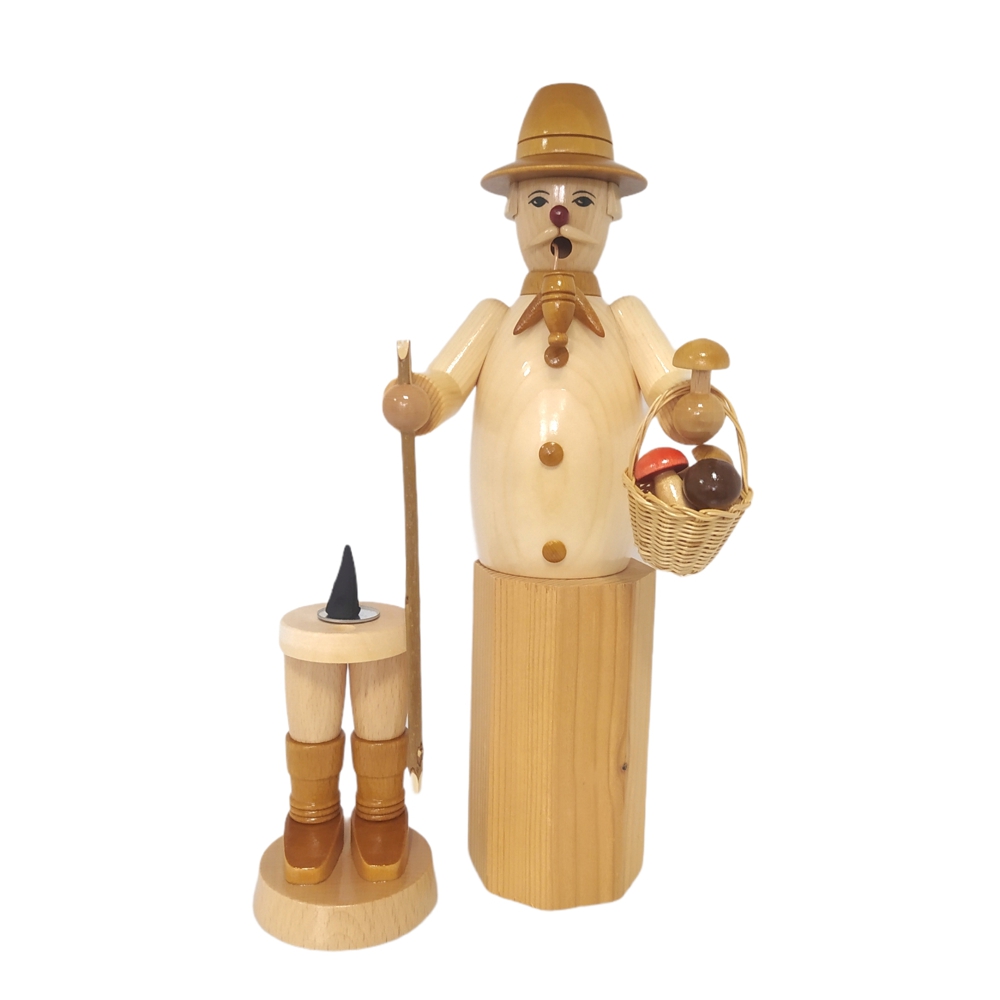 Mit Wanderschuhen an den Füßen und einem Korb in der Hand macht sich der Räuchermann Pilzsammler auf den Heimweg, seine Ausbeute des heutigen Tages kann sich sehen lassen, sein Korb ist voller verschiedener Pilze. Gekleidet ist er mit braunen Schuhen, heller Hose sowie einem braunen Hut, sein helles Hemd ist mit braunen aufgesetzten Knöpfen verziert. Wie es sich für einen richtigen Räuchermann gehört hat auch der Pilzsammler eine fertig gestopfte Pfeife im Mund hängen. Dieser kleine Kerl mit dem freundlichen Gesicht, der roten Nase sowie dem hellen Schnauzbart passt sich jeder Einrichtung an und ist immer ein absoluter Hingucker.