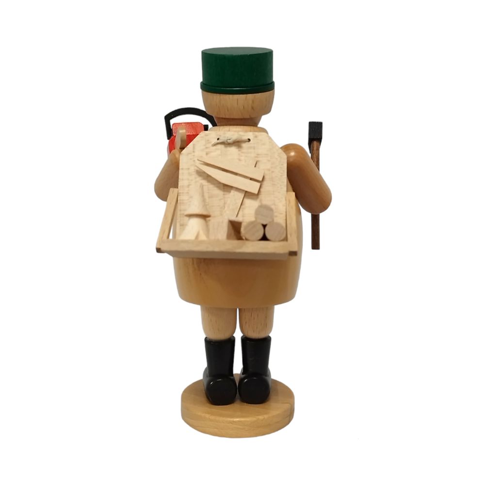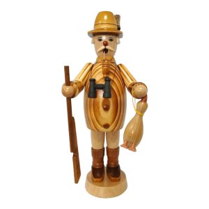 Mit schwarzen., derben Stiefeln steht der natur-farbene Räuchermann auf einem kleinen Podest, gekleidet ist er mit einer natur-farben Jacke welche von schwarzen Knöpfen zusammengehalten wird sowie einem grünen Hut und heller Hosen.