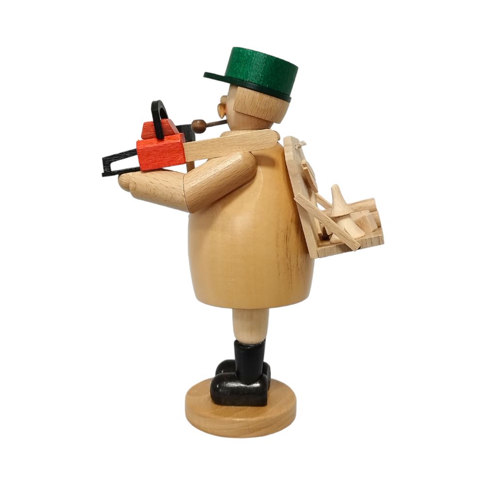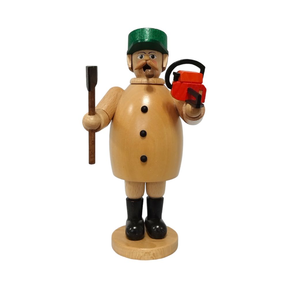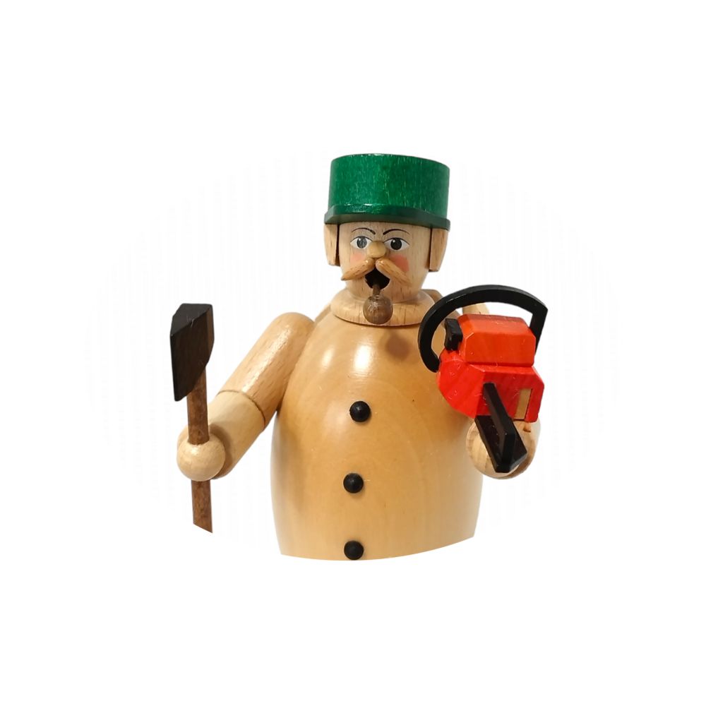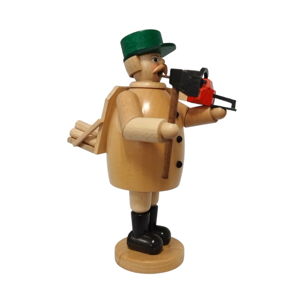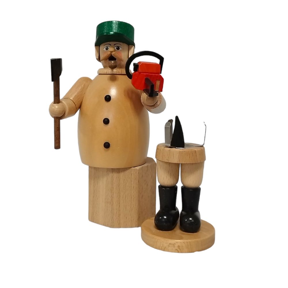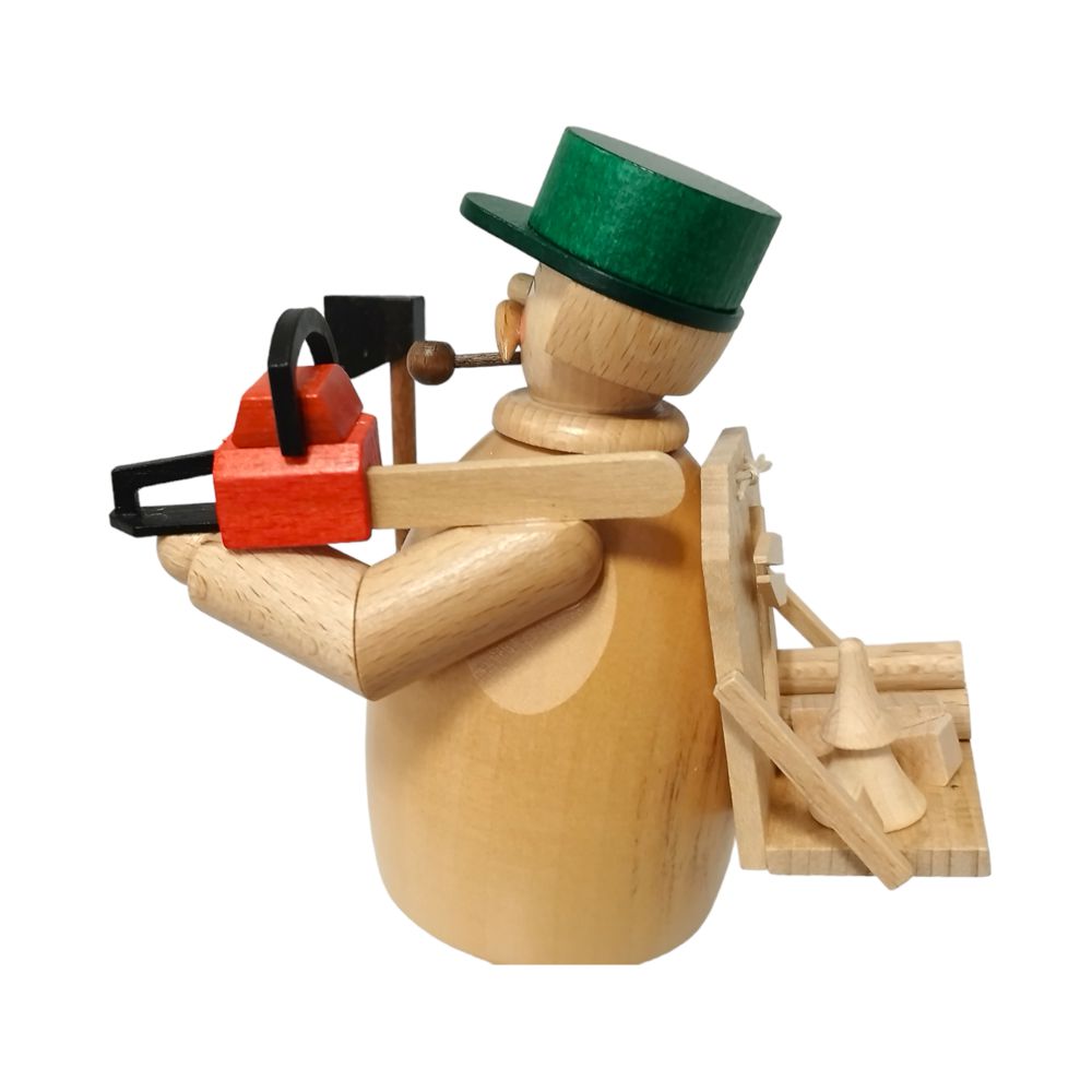Ganz in natur gehalten ist dieser Räuchermann Waldarbeiter ein echter Hingucker, mit Kettensäge und Beil in der Hand hat er auf dem Rücken ein Trage auf der Holzscheite, Werkzeug sowie kleine, handgefertige Bäumchen liegen.