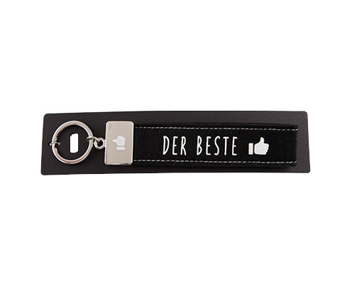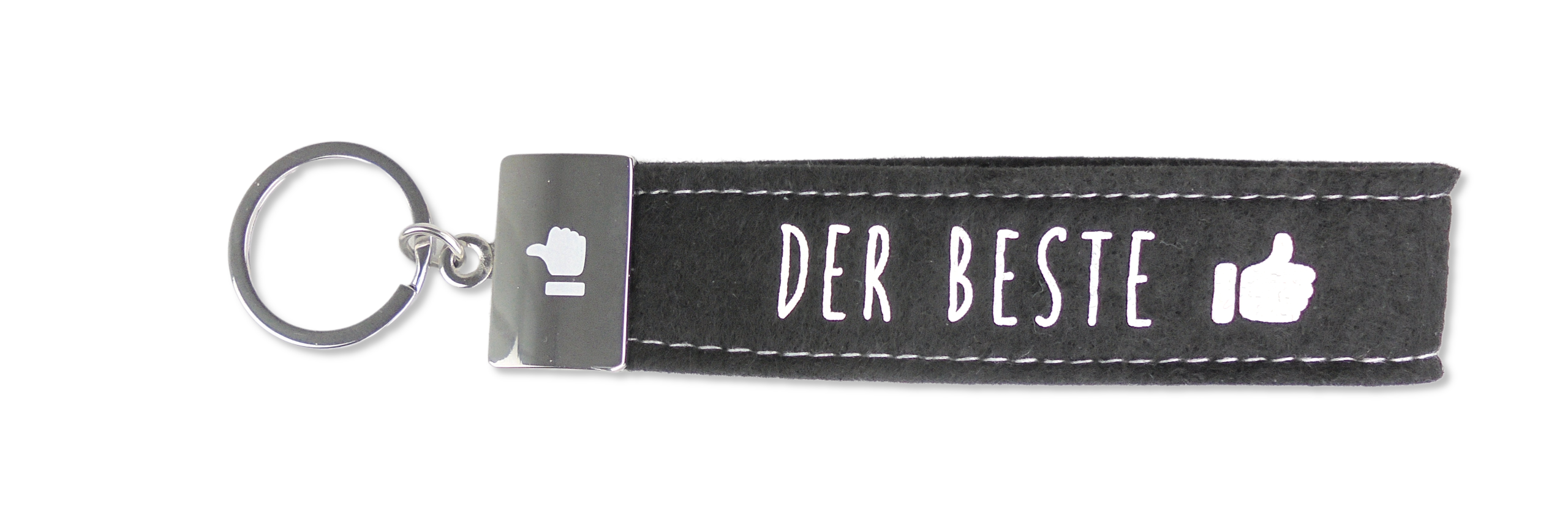 Dieser kultig bedruckte Schlüsselanhänger besteht aus einer Filzschlaufe, mit Sticknaht und einem Metallabschluss. Das Schlüsselband ist mit einem coolen, lustigem oder liebevollen Spruch auf der Vorderseite bedruckt. In diesem Fall ist das Filzband in der Farbe Schwarz, mit der Aufschrift “Der Beste” und einem “Daumen hoch” versehen. Auf den Metallabschluss ist ebenfalls ein “Daumen hoch” gedruckt.