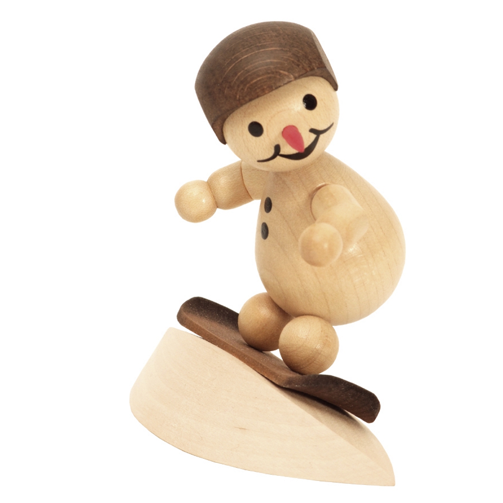 Kugelrund, rote Karottennase und schwarze Kohleknöpfe am Bauch, genauso muss ein richtiger Schneemann aussehen. Vorbildlich mit Helm auf dem Kopf saust der kleine Schneemann mit seinem Snowboard den Berg hinab.