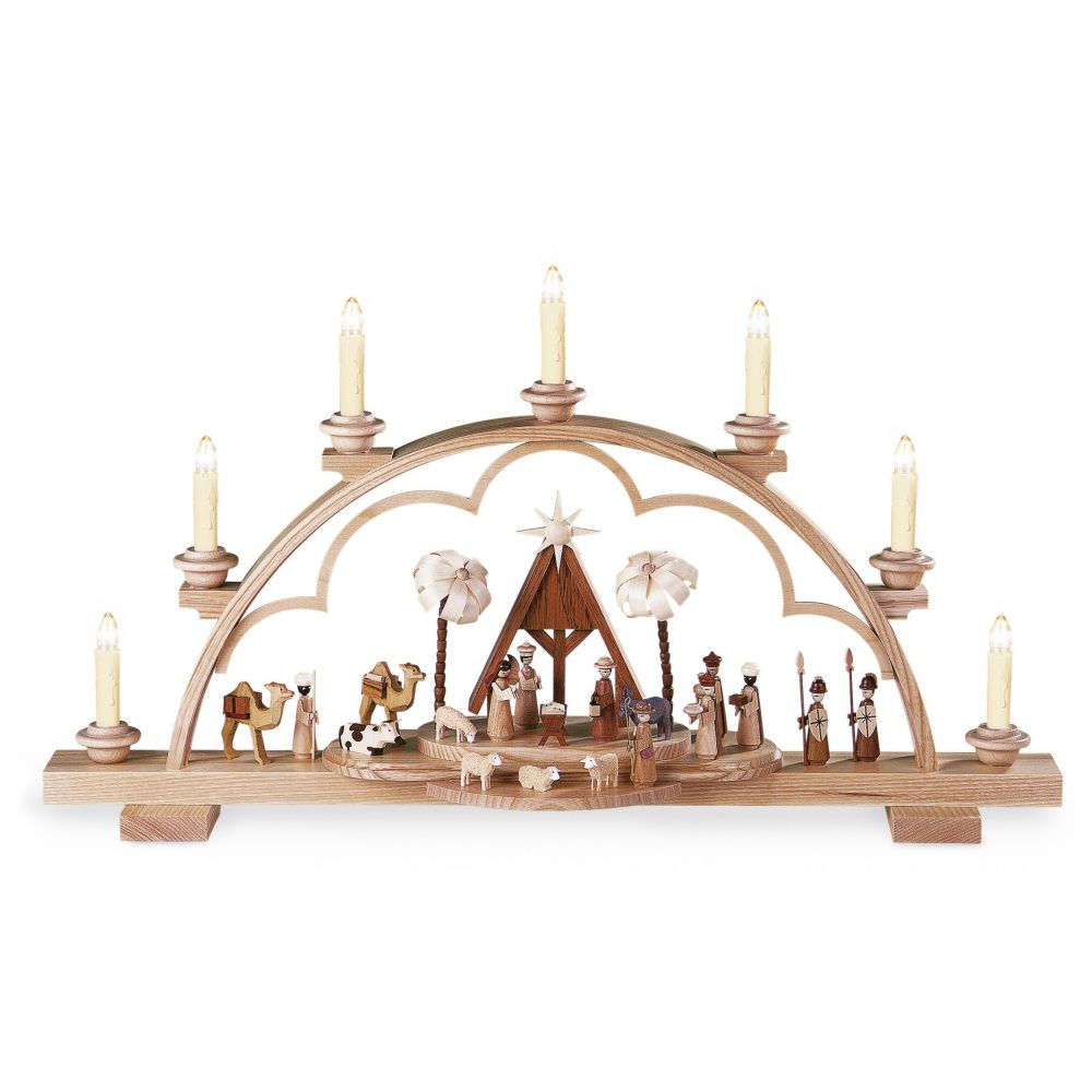 Auf diesem Schwibbogen Heilige Geschichte, elektrisch erwacht die Heilige Geschichte, mit ihren detailreichen Figuren und handgeschnitzten Tieren, im Glanze der Kerzen zum neuem Leben. Unter dem Dach des Stalls beten Maria und Josef vor der Grippe. Geleitet von dem Stern von Bethlehem kommen Hirten, Kameltreiber, die Drei Weisen aus dem Morgenland aber auch Soldaten des Herodes an. Die aufwendig gedrechselten Bäume umranden die Szene, welche von elektrischen Kerzen (34V LED) beleuchtet wird. Im Glanze der sieben elektrischen Kerzen (230V) erstrahlt die wundervolle Heilige Geschichte auch an Ihrem Fenster.