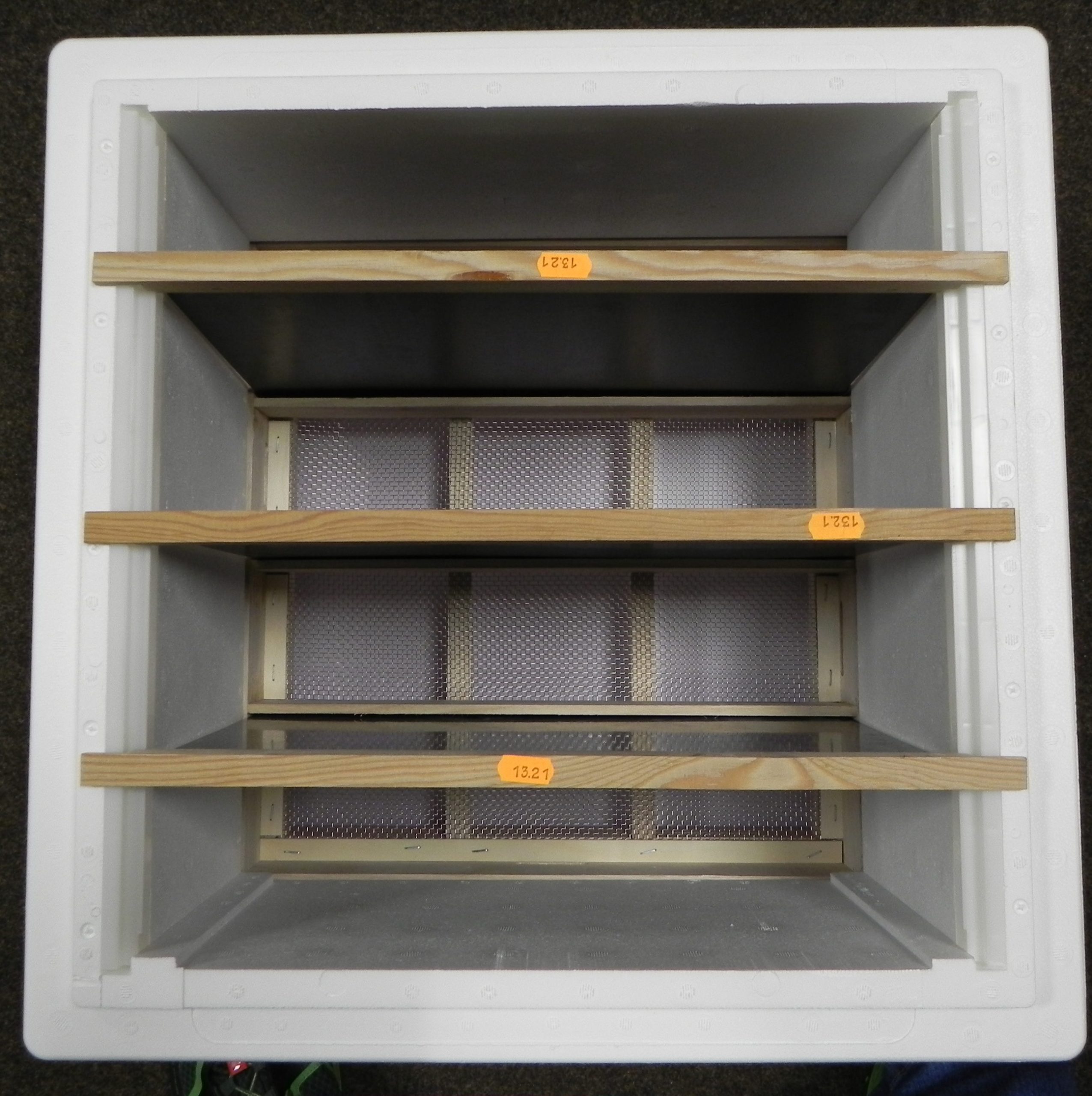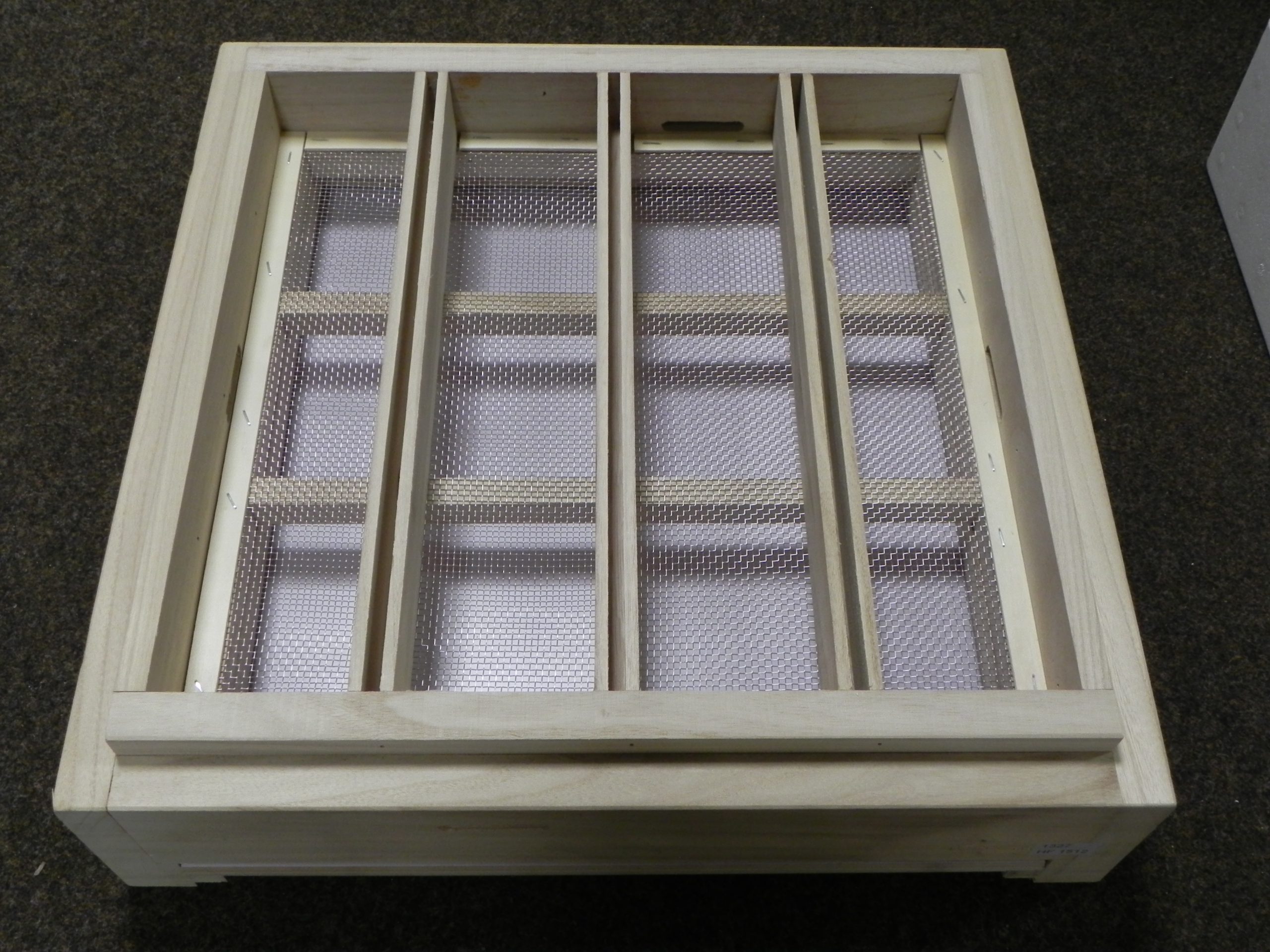 Aus astfreiem Massivholz, mit Edelstahl Varroagitter, Bodenschieber und vier Fluglöchern.