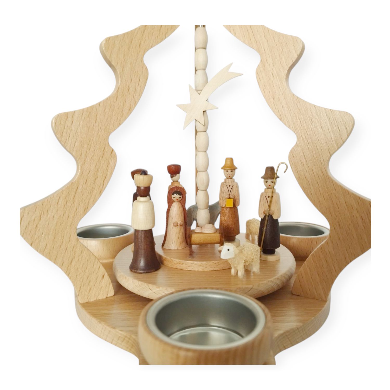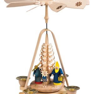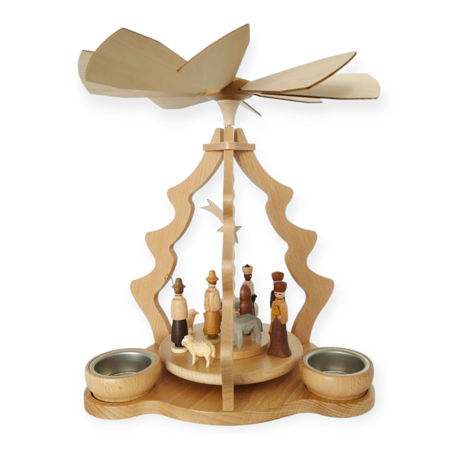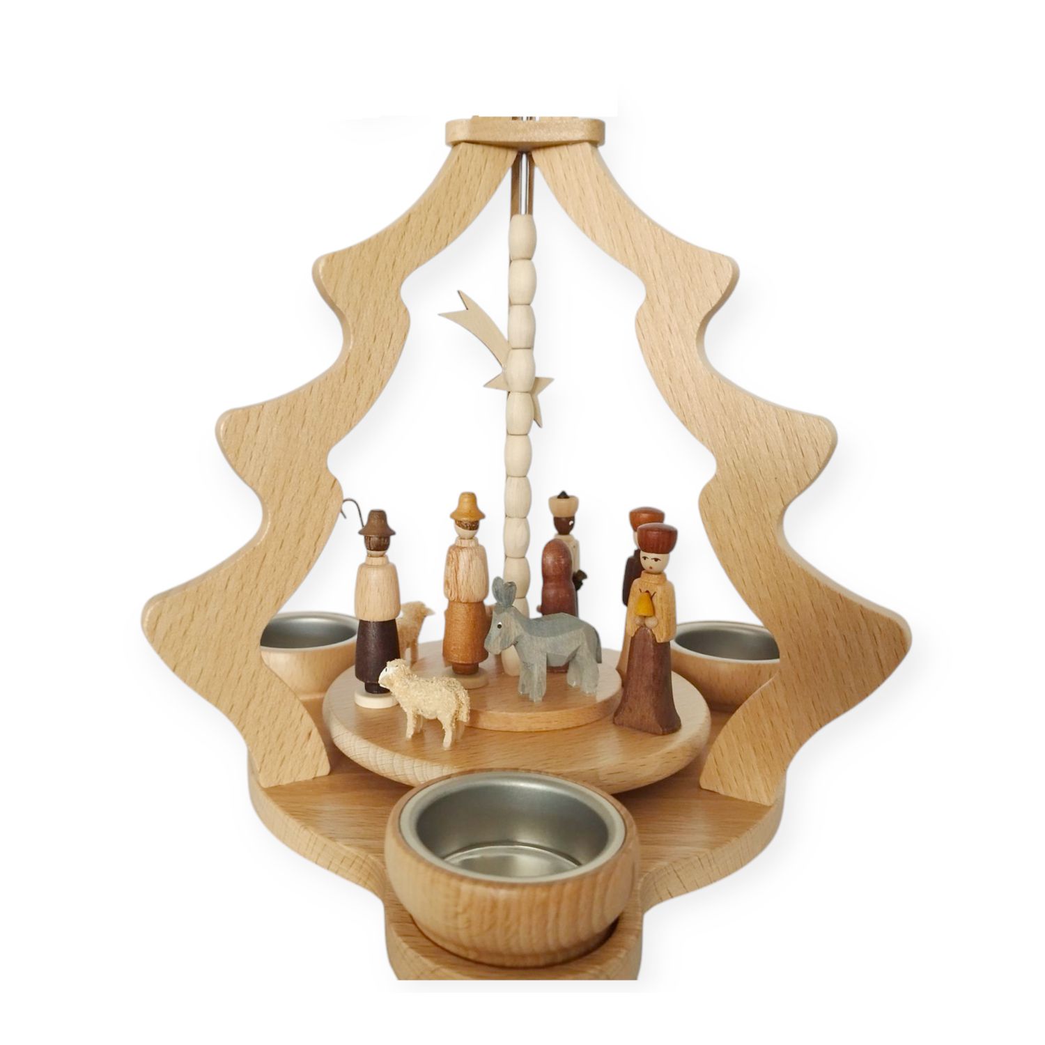 Die Pyramide beeindruckt nicht nur durch ihre kunstvolle Gestaltung, sondern auch durch ihre meisterhafte Handwerkskunst, weshalb sie eine besondere Ausstrahlung besitzt. Die warmen Holztöne der Figuren ergänzen sich harmonisch, sodass das Gesamtbild besonders lebendig erscheint. Während die aufsteigende Wärme der Teelichter den oberen Propeller sanft antreibt, beginnt sich die Szene langsam zu drehen, wodurch sie zum Leben erwacht.