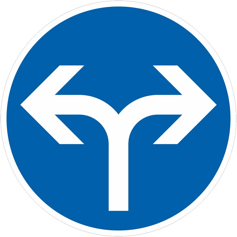 Das Schild 214-30 nach StVO „Vorgeschriebene Fahrtrichtung rechts oder links“ ist ein rundes Verkehrszeichen (Ronde) mit blauem Grund und nach rechts und links gegabelten Pfeilen in Weiß.