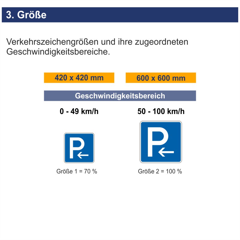 Bedeutung: Steht das Parkschild auf der rechten Straßenseite, weist der Pfeil in Richtung Fahrbahn. Dies bedeutet, dass hinter dem Schild ein Bereich beginnt, in dem geparkt werden darf. Steht es auf der linken Straßenseite, beispielsweise in Einbahnstraßen, zeigt der Pfeil von der Fahrbahn weg – hier ist das Parken im Bereich vor dem Parkschild erlaubt.